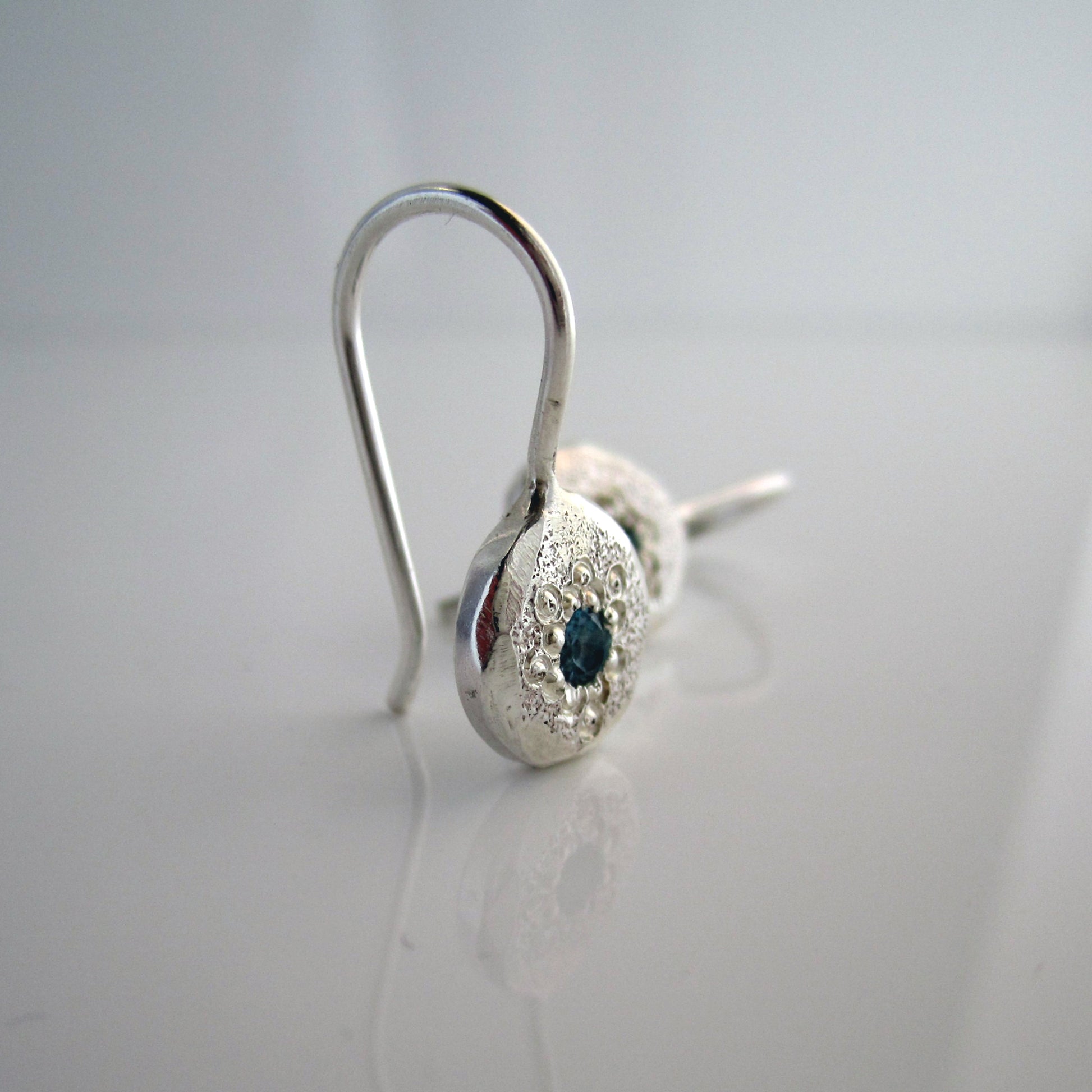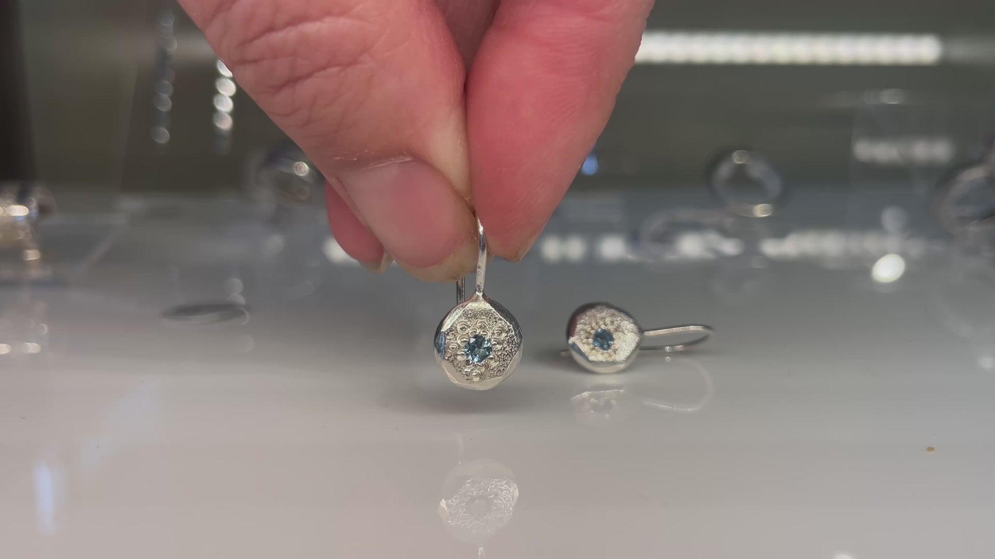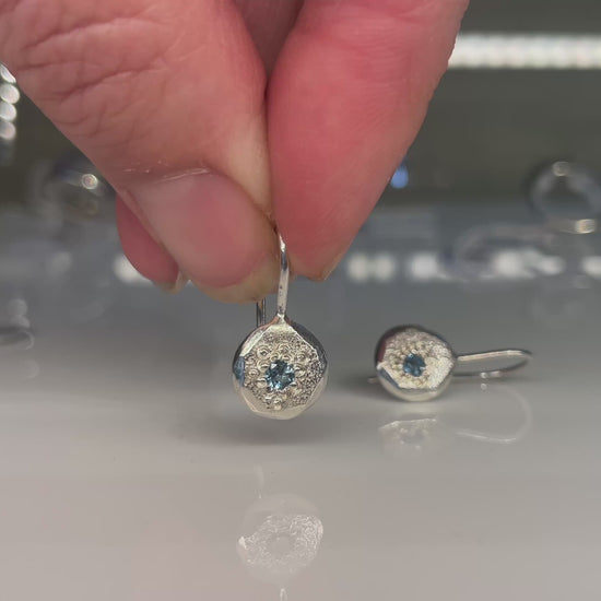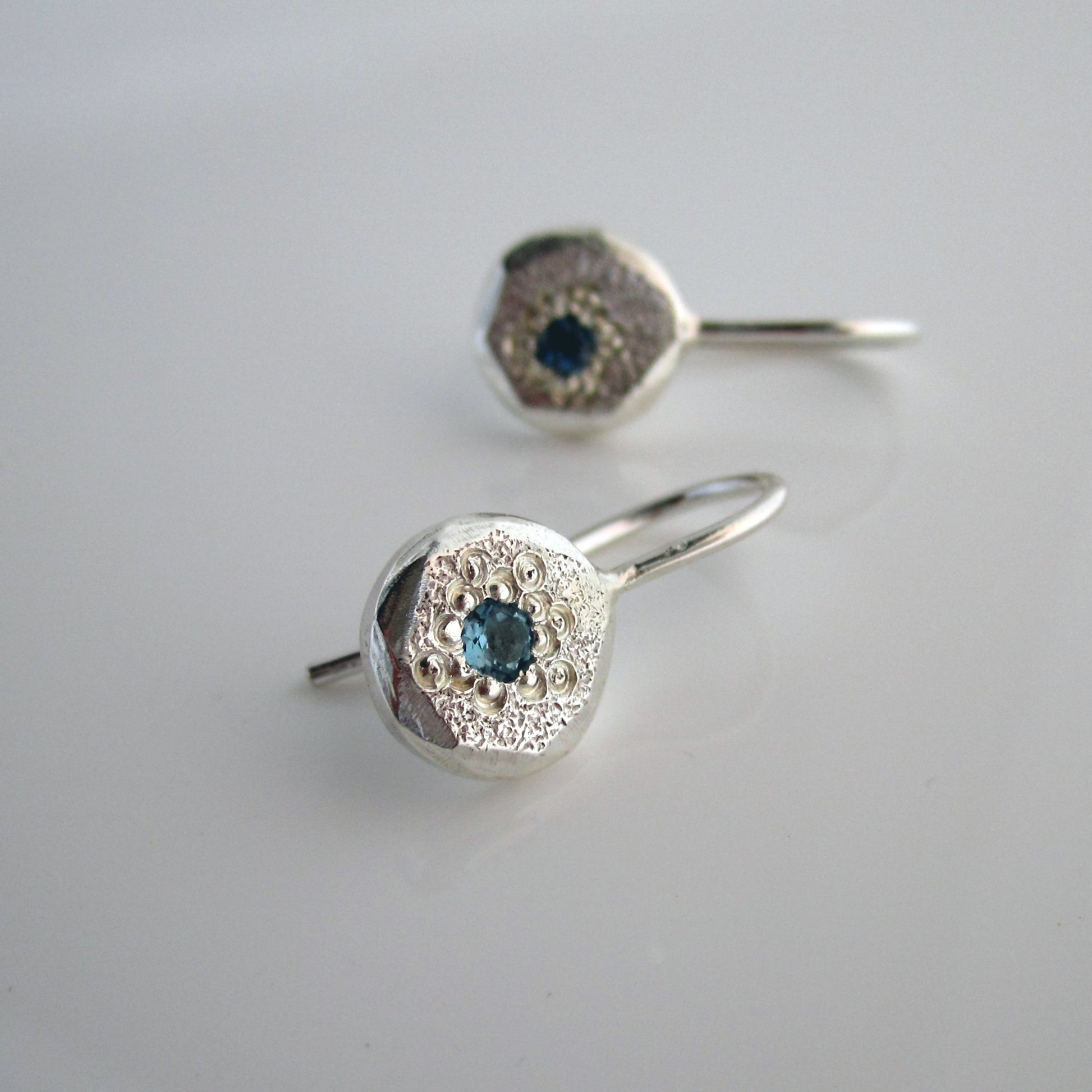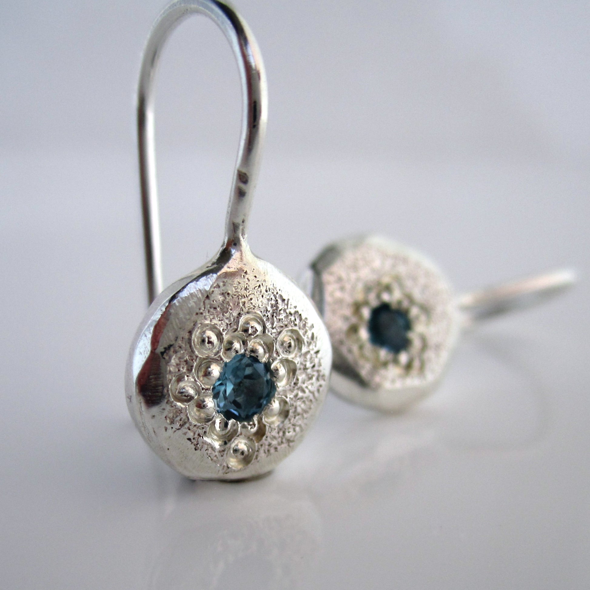 Hand carved showing makers marks and texture, these sweet little drops hold a sparkling 3mm faceted London Blue Topaz stone. The surface of each organically formed disc has been textured to sparkle and shimmer just like the night sky. No two pairs are the same making yours truly special to treasure forever.