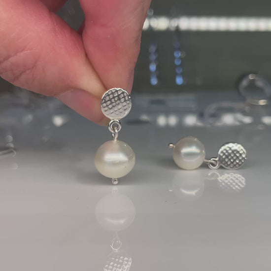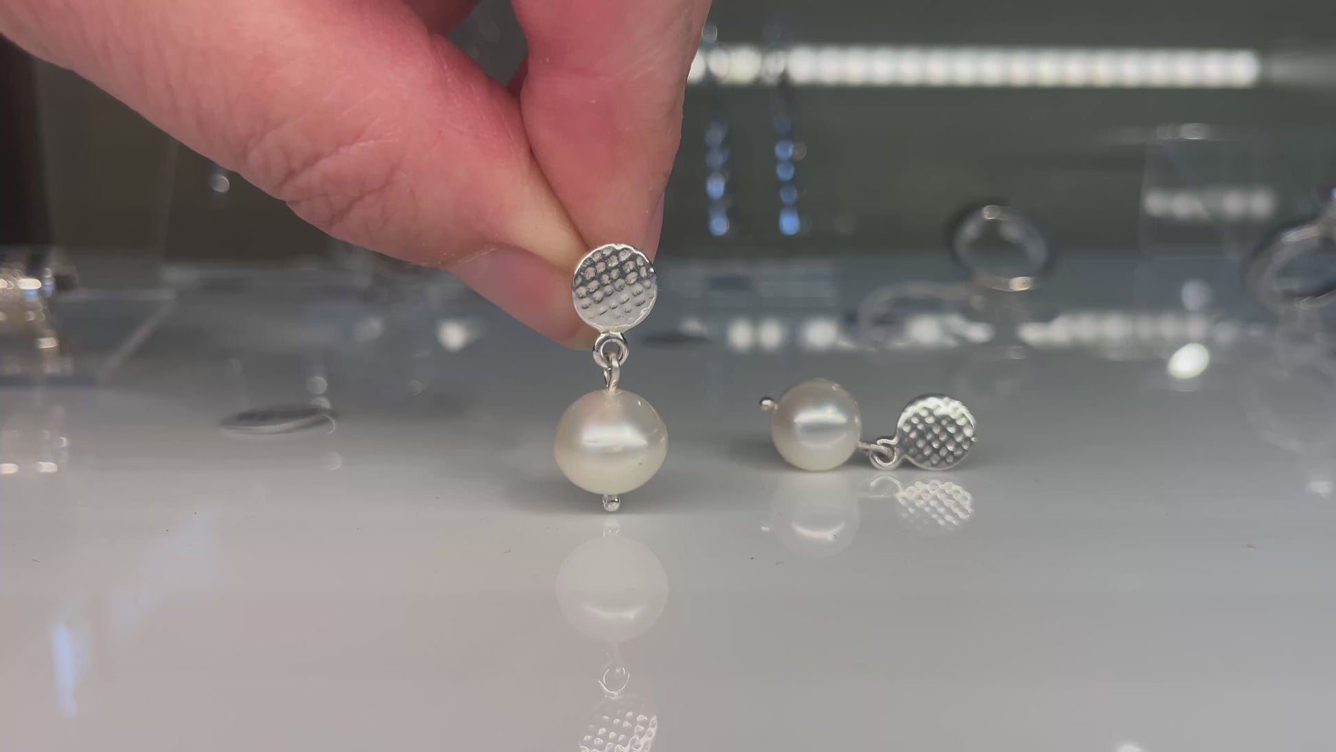 Luminous freshwater pearls drop from Sterling Silver discs imprinted with vintage linen for a textural effect. A timeless and wardrobe essential, pearls hold their classic elegance whether teamed with a tee and jeans or adorning you on your special evening out.